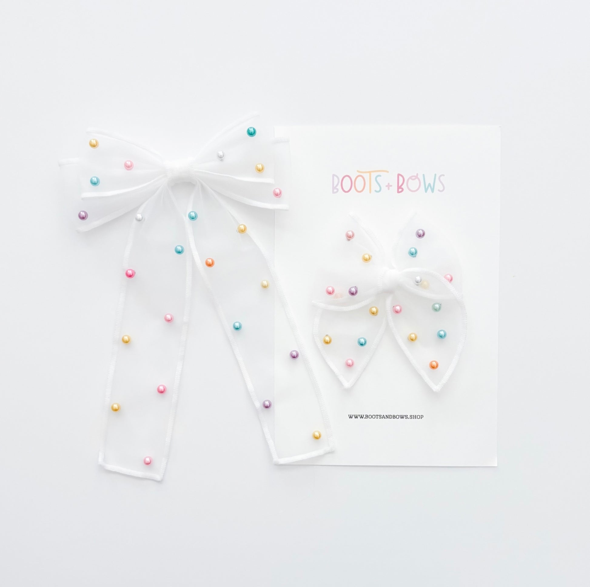 Crafted with a lightweight mesh base and finished with delicate pearl details, these bows are the sweetest statement piece. Available in small and large.