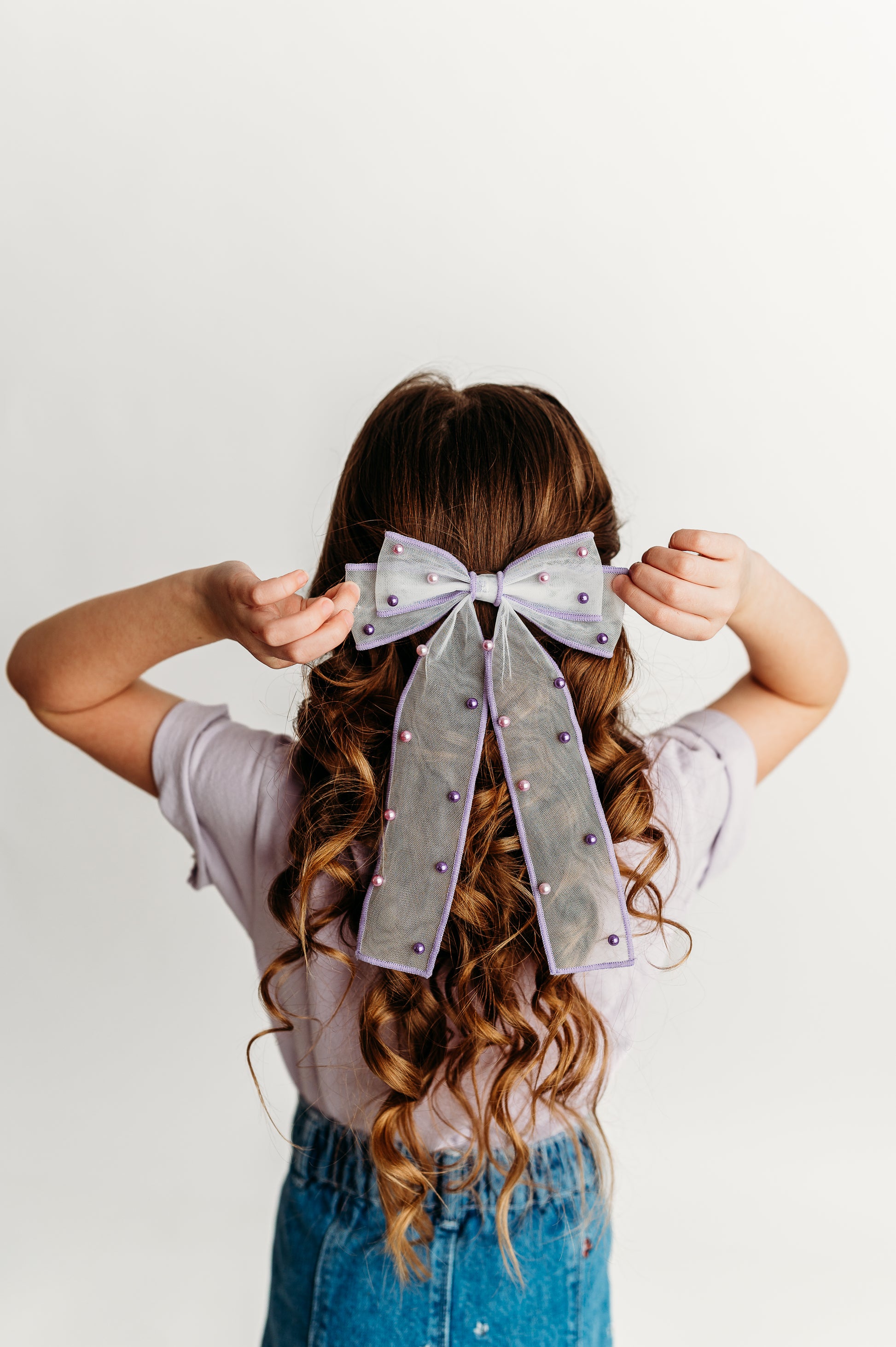 Crafted with a lightweight mesh base and finished with delicate pearl details, these bows are the sweetest statement piece. Available in small and large.